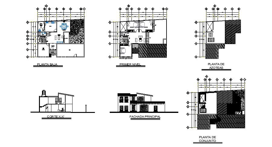 Architectural plan of 2 storey bungalow 16.70mtr x 12.66mtr with elevation and section in dwg file