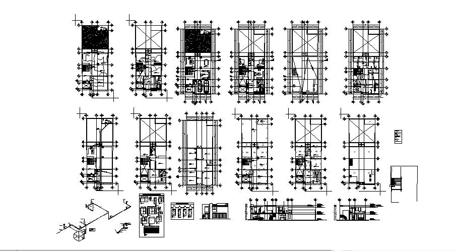 Architectural plan of house 9.95mtr x 25.00mtr with section and elevation in dwg file which includes detail of front elevation, side elevation, electric layout plan, sanitary layout plan, etc it also gives detail of hall, bedroom, kitchen, dining room, bathroom, toilet, etc