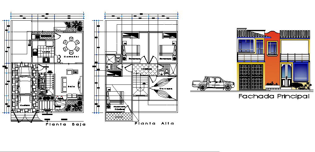 Autocad drawing of house 8.50mtr x 10.80mtr with detail dimension which includes detail of hall, bedroom, kitchen with dining area, bathroom, toilet, car parking, etc it also provide detail of front elevation.