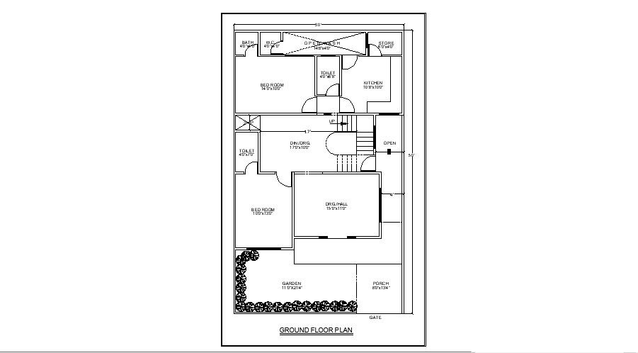 Ground floor plan of home 30' x 50' with furniture detail in AutoCAD which provide detail dimension of the garden area, porch, living room, bedroom, kitchen, store room, WC and bath, etc.