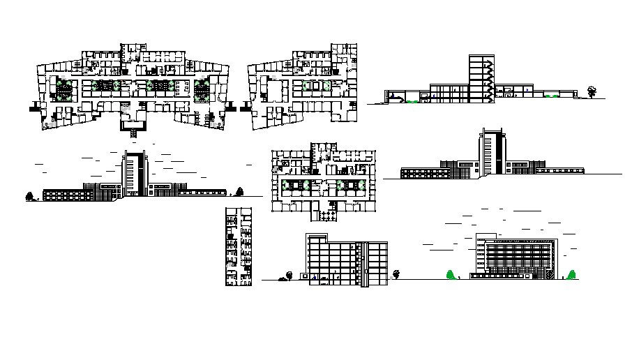 Architectural plan of a general hospital with elevation and section in dwg file which includes detail of front elevation, side elevation, rear elevation, back elevation, a different section of the hospital, detail of different floor, detail of different department in a hospital, etc it also gives detail of the top view of hospital.