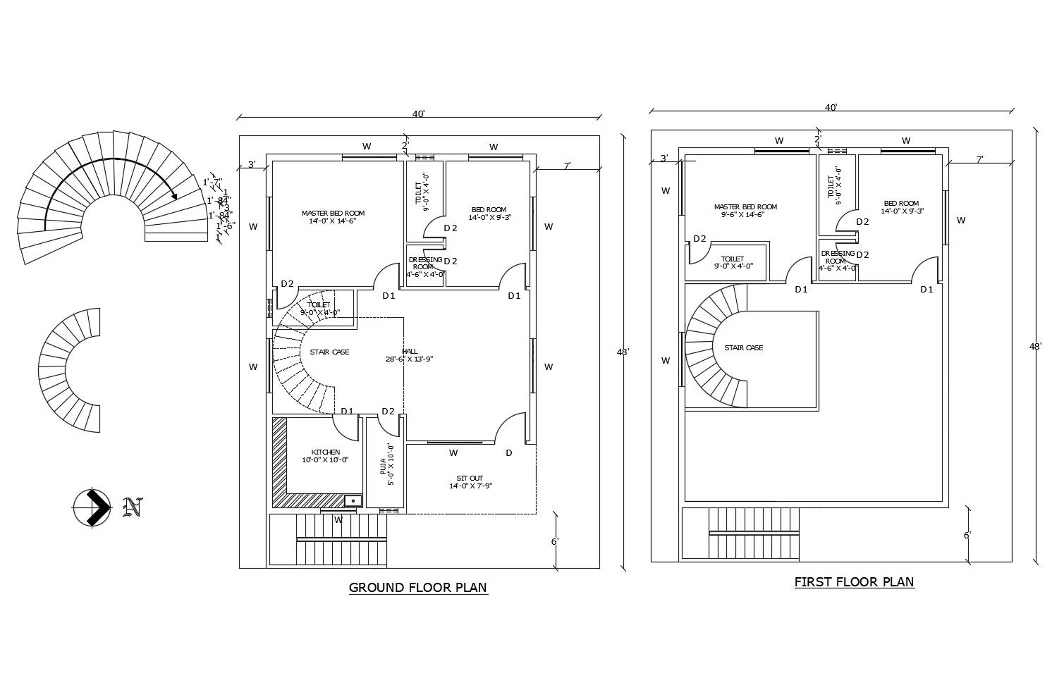 Floor plan of residential house 40' x 48' with detail dimension in AutoCAD file which includes detail of sit out, hall, master bedroom, bedroom, kitchen, dining area, bathroom, toilet, etc it also gives detail of staircase.