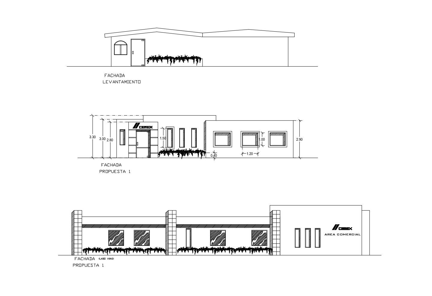 Autocad drawing of office with different elevation. Which includes front elevation, side elevation, back elevation, door and windows details.