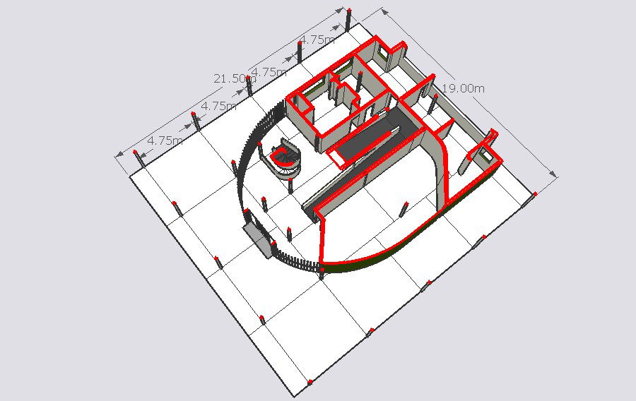 Drawing of building in SketchUp file which provides detail of walls, open area, doors and windows, staircase, elevator, etc.
