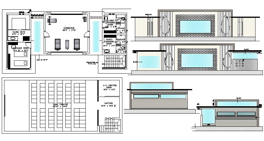 Ground floor plan of the gym with elevation in dwg file which provides detail of side elevation, back elevation, detail of gym area, massage room, sauna bath, ladies changing room, gents changing room, washroom, toilet, etc it also gives detail of basement plan.