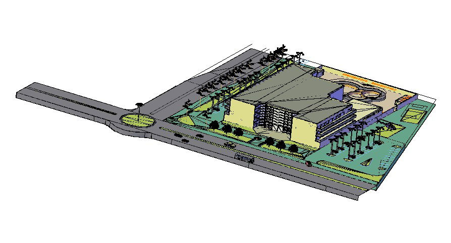 3D model of the multistory building in dwg file it include parking space, exterior view of the building, basketball court, landscaping, garden area, parking area, entrance, etc.