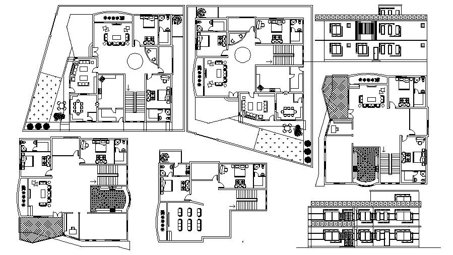 Drawing of the bungalow with elevations in dwg file It includes ground floor, first floor, elevations it also includes living room, kitchen, bedroom, balcony, garden area, dining area.