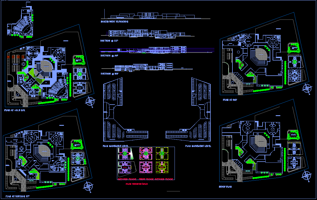 The architectural design of the AutoCAD DWG Drawing Cultural center building floor plan and the elevation is given in this drawing file. Sectional details are clearly given in this drawing file. Car parking drawing, Garden, and Plantation drawing, Theater, Theater lobby, Children's play area, Residential floor plan, Guest house are Given in this drawing DWG file.