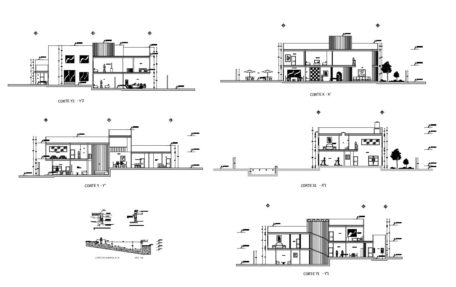 Single family house with section details in dwg file which provide detail of different section, detail of floor level, detail of garden area, etc.