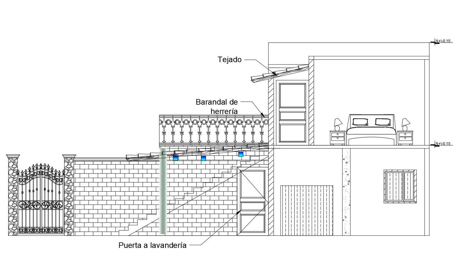 Side elevation of the house with detail dimension in dwg file which provides detail of bedroom, doors, and windows, detail of the main door, etc.
