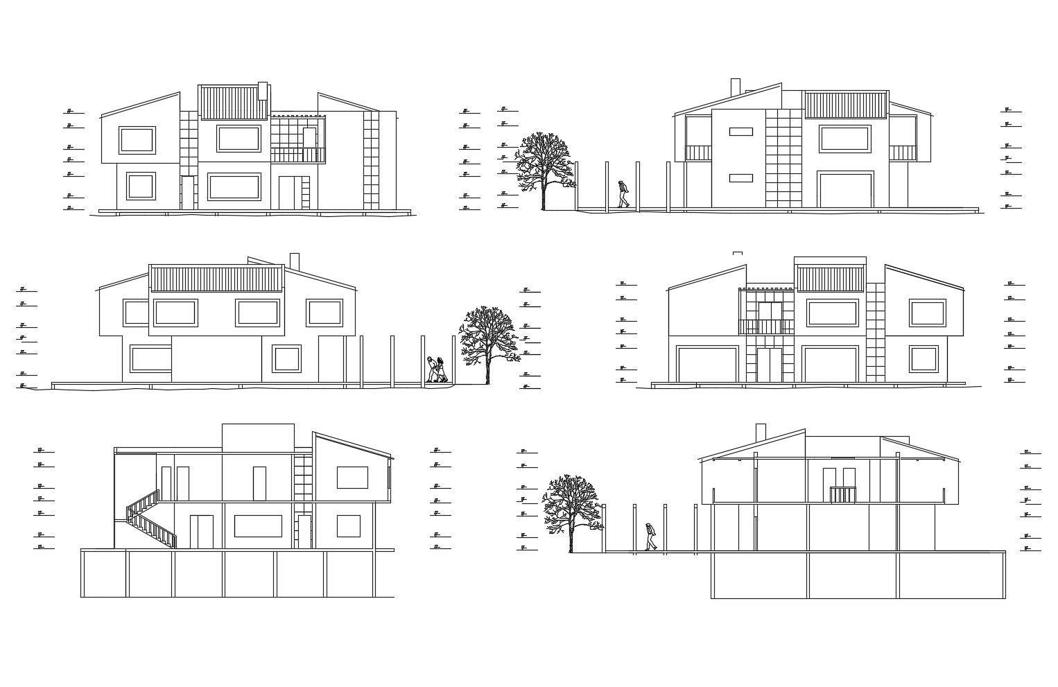 Elevation drawing of the bungalow in dwg file which includes detail of front elevation, back elevation, right side elevation, left side elevation, detail of floor level, etc.