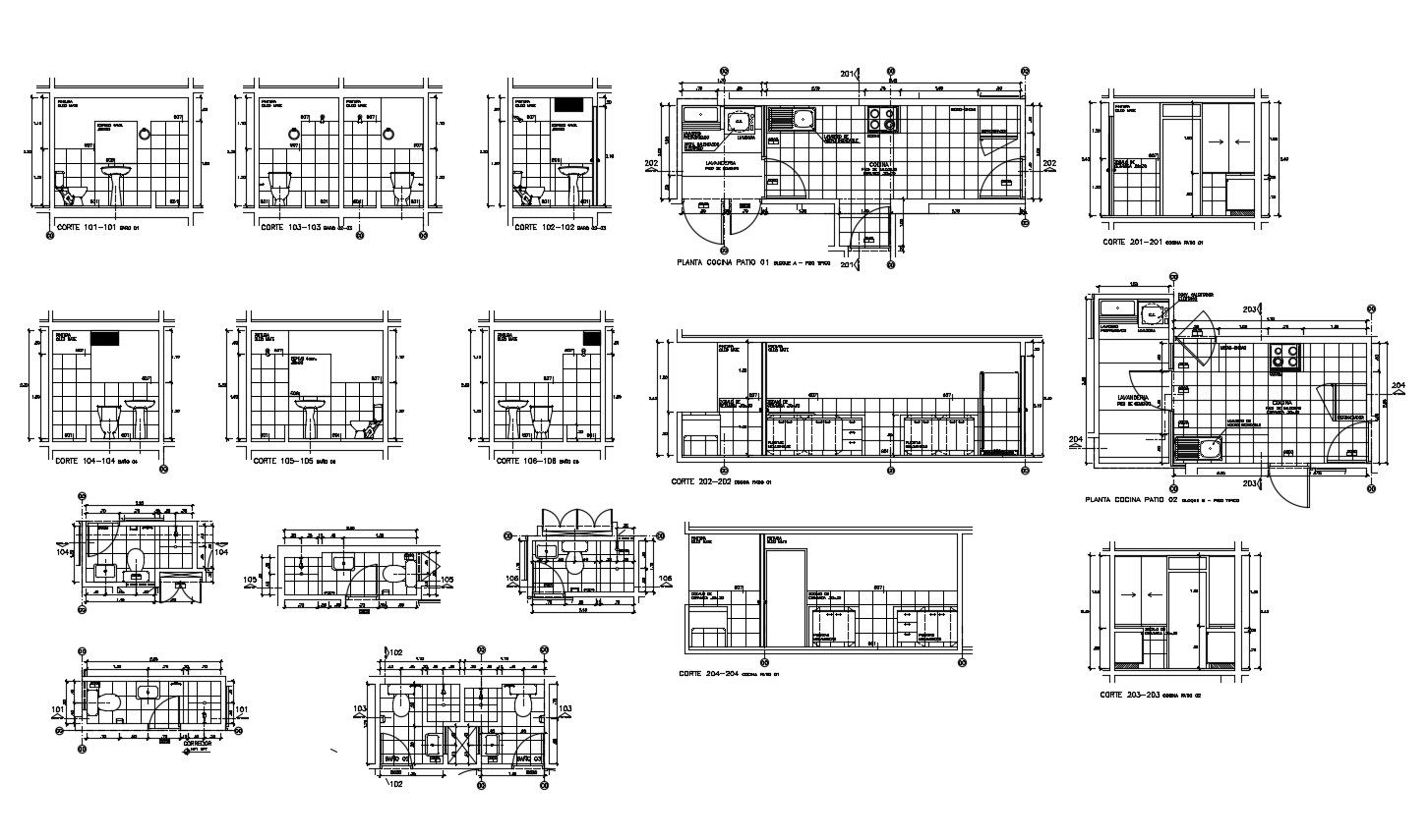 Dwg file of bathroom and kitchen with sections it include kitchen floor plan, bathroom floor plan, sectional elevations etc