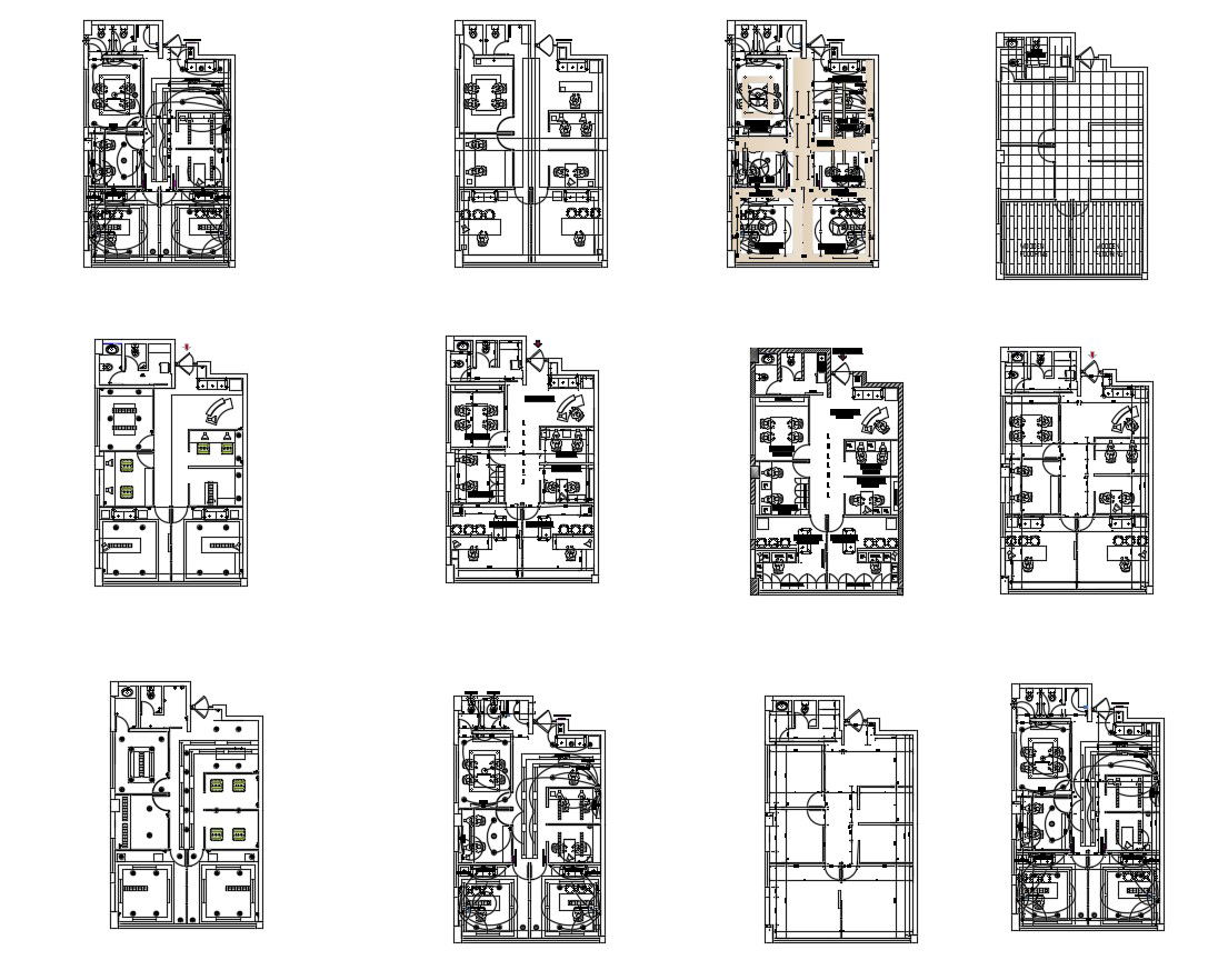 Autocad drawing of office it include floor layout,furniture layout,flooring layout,electrical layout,ceiling layout,it also include MD's cabin,reception area, waiting area,meeting area,staff department, account department, toilets, etc