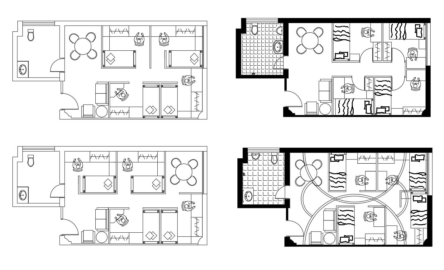Autocad drawing of guest house it include alternate option of furniture layout, it also include bedrooms, reception area, waiting area, toilets etc