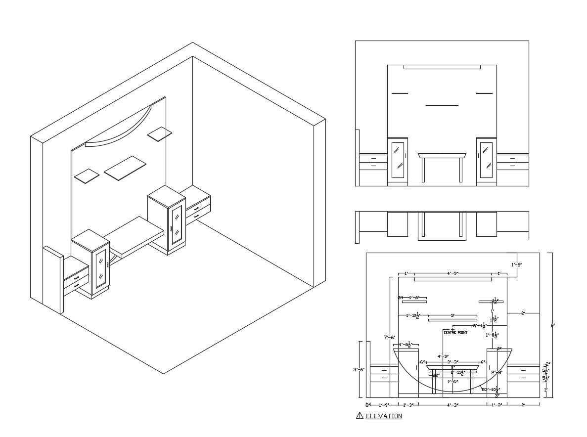 Detail of tv cabinet in autocad it include plan with dimensions,elevation,isometric view,etc