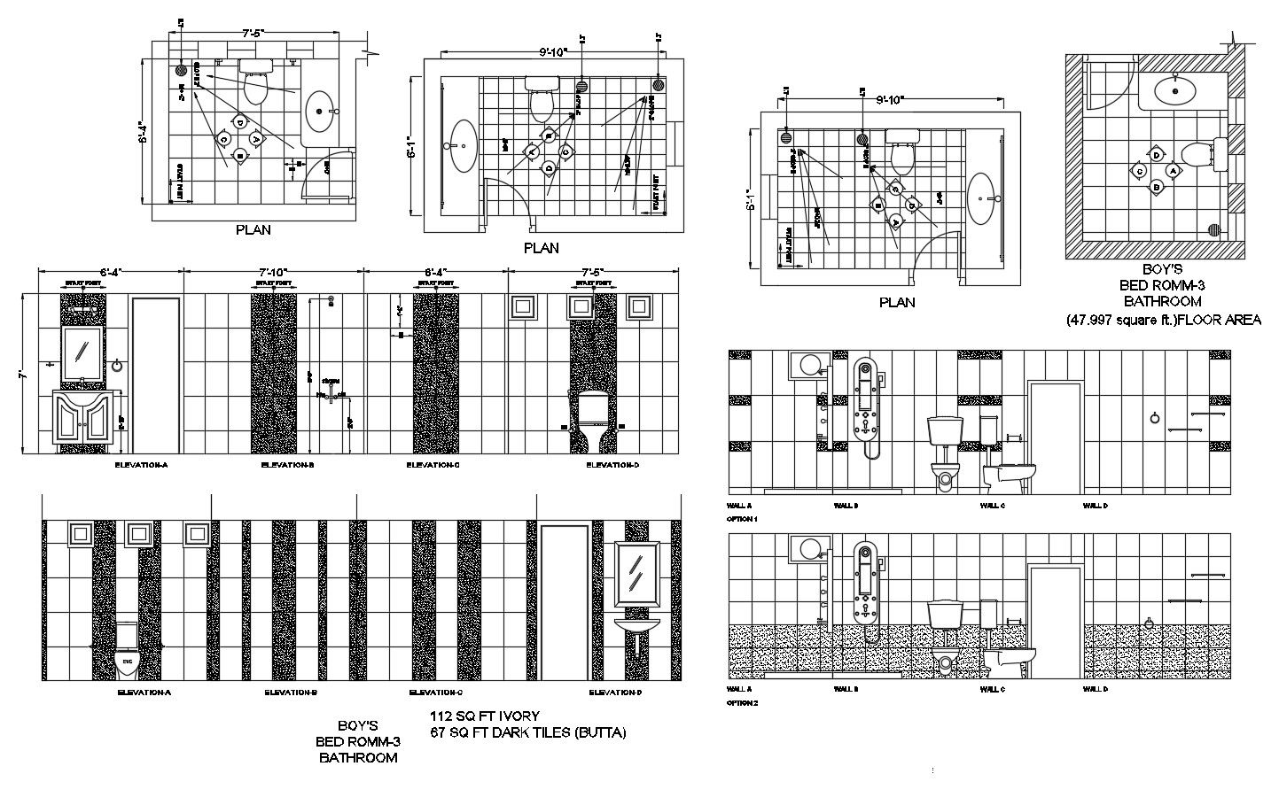 Autocad drawing of bathroom with sections it include bathroom layout,elevation,wall tiles, floor plan, shower area, basin area, etc