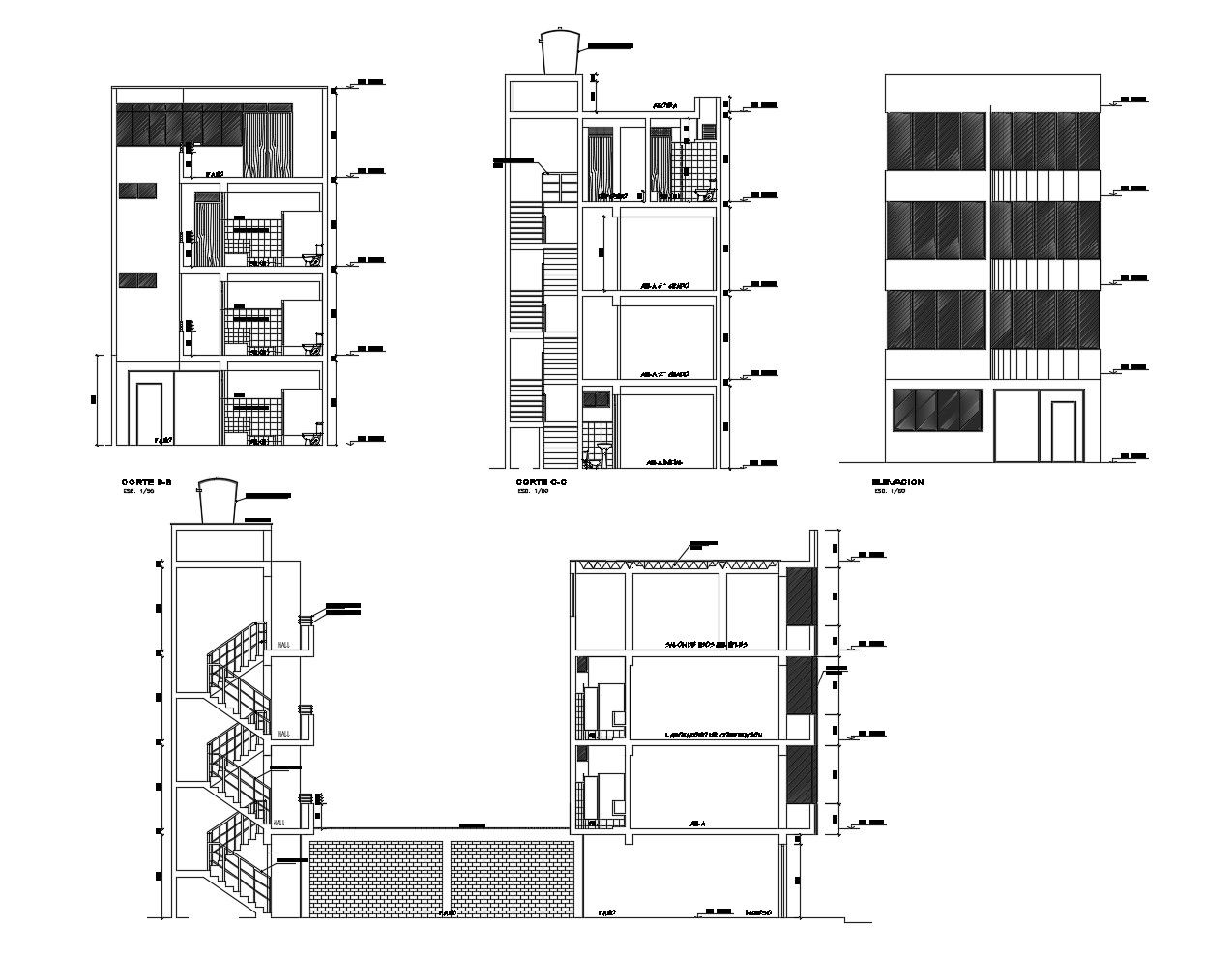 4 storey building with elevation and section in AutoCAD