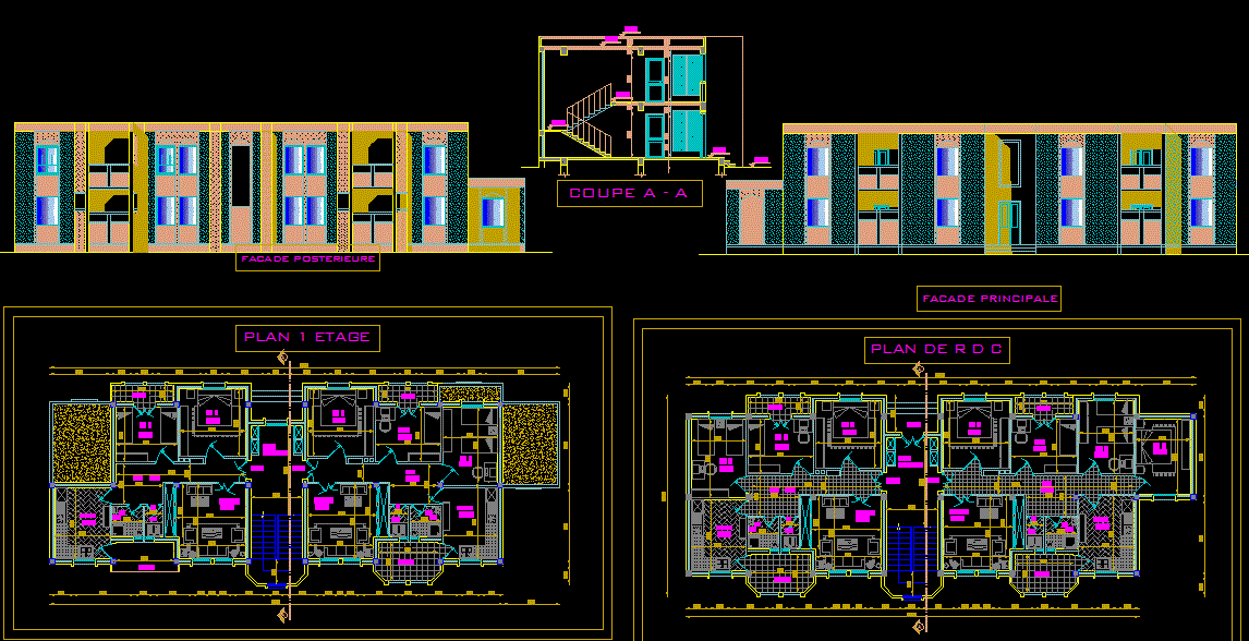 This Twin Bungalow DWG design includes modern front and back elevations, layout, and section plans ideal for architects, designers, and civil engineers.