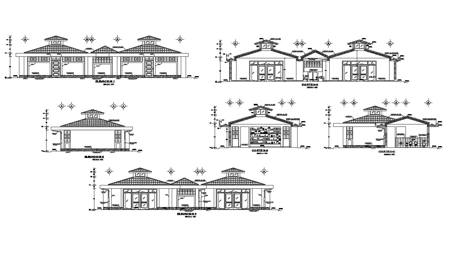 Autocad drawing of residential house elevations it include sections, elevations, front facade, it also include floor level,doors, windows, terrace levels, etc