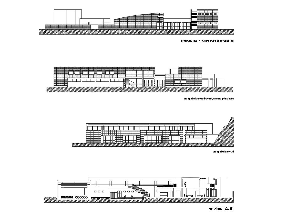 Autocad drawing of hostel elevations it include front facade, sections, rear elevations, south elevation, north elevation, etc