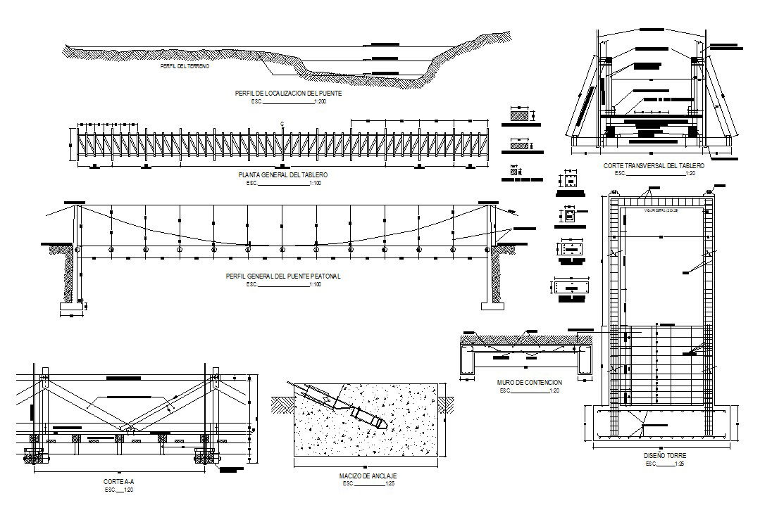 Construction detail of suspension bridge in autocad it include details of retaining wall,tower design,sections,vertical suspenders, etc