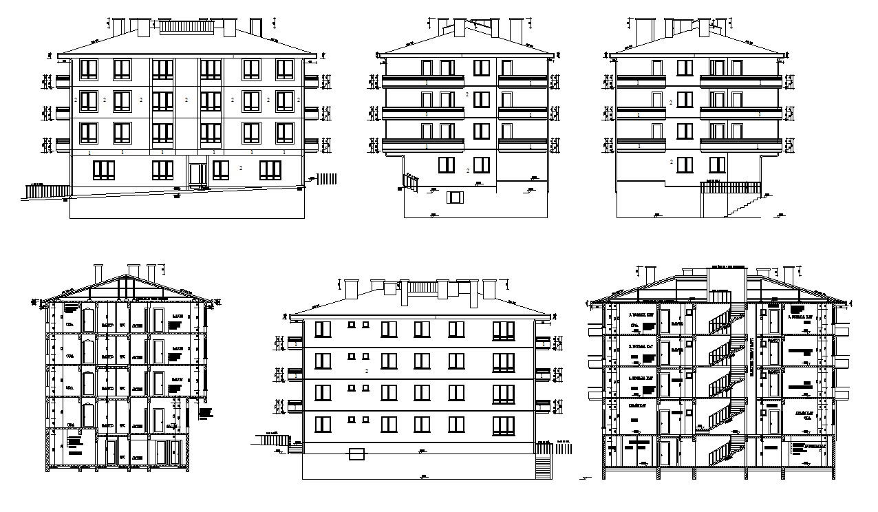 Dwg file of residential apartment elevation it include front facade,rear elevation,section,it also include floor level,doors,windows,balcony, etc