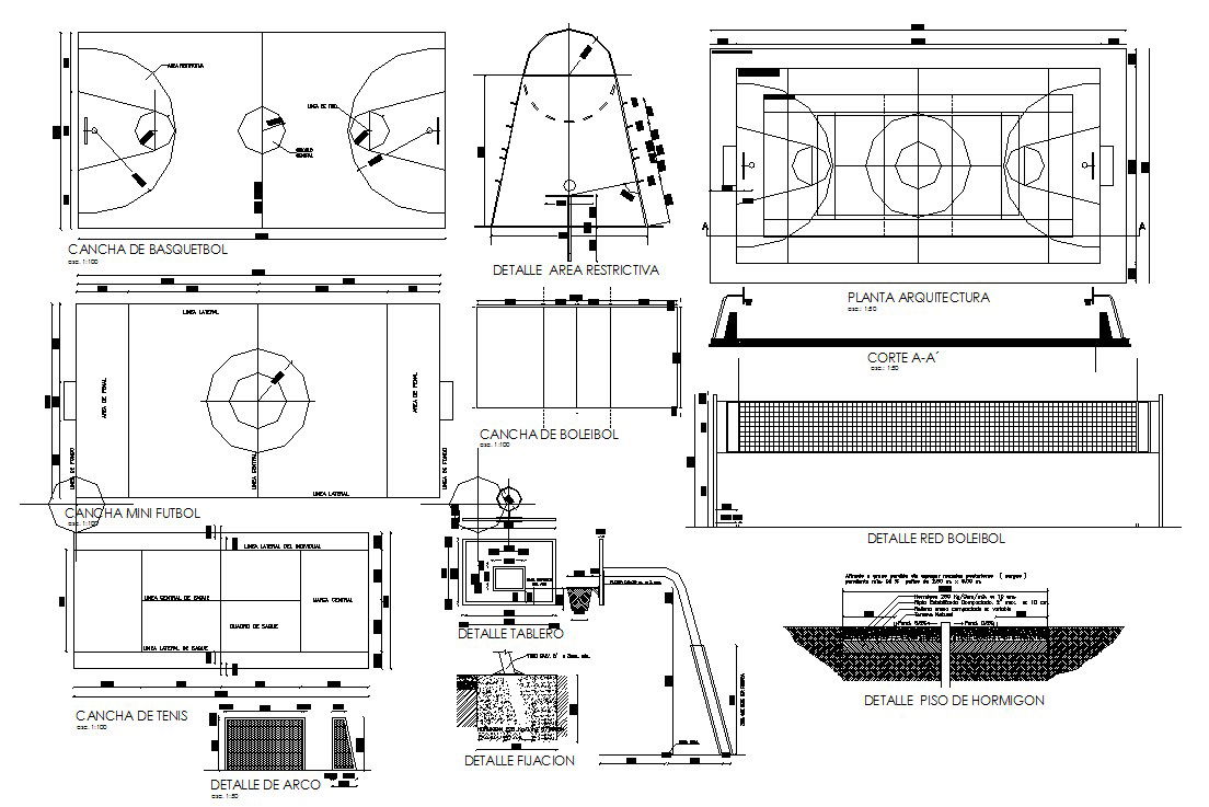 Detail Construction drawing of basket ball court in dwg file it include detail of basketball court,net detail,board detail, etc