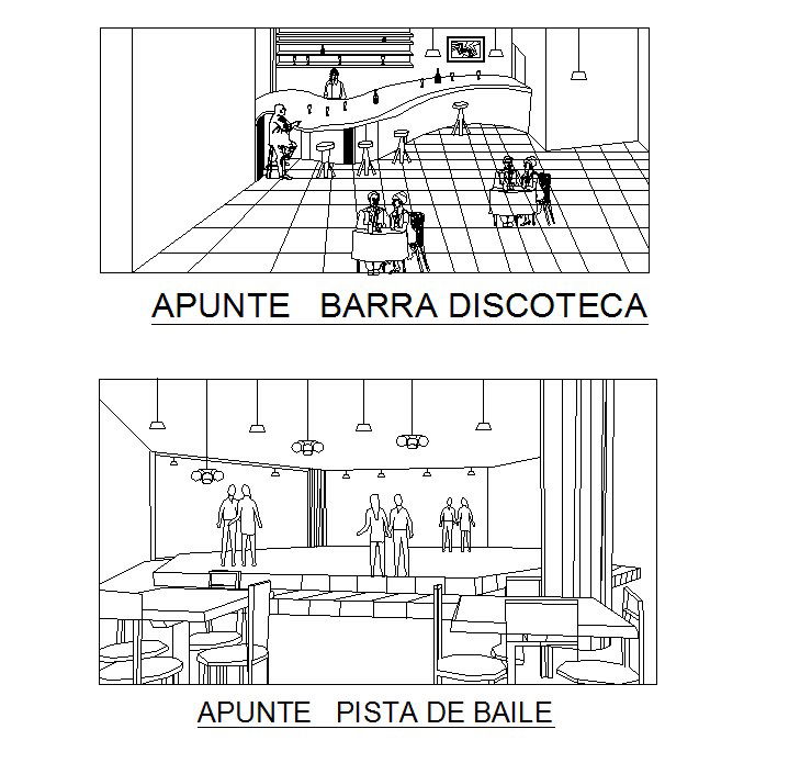 Perspective view of bar in autocad it include seating area,serving counter,hanging lights,dance floor, etc