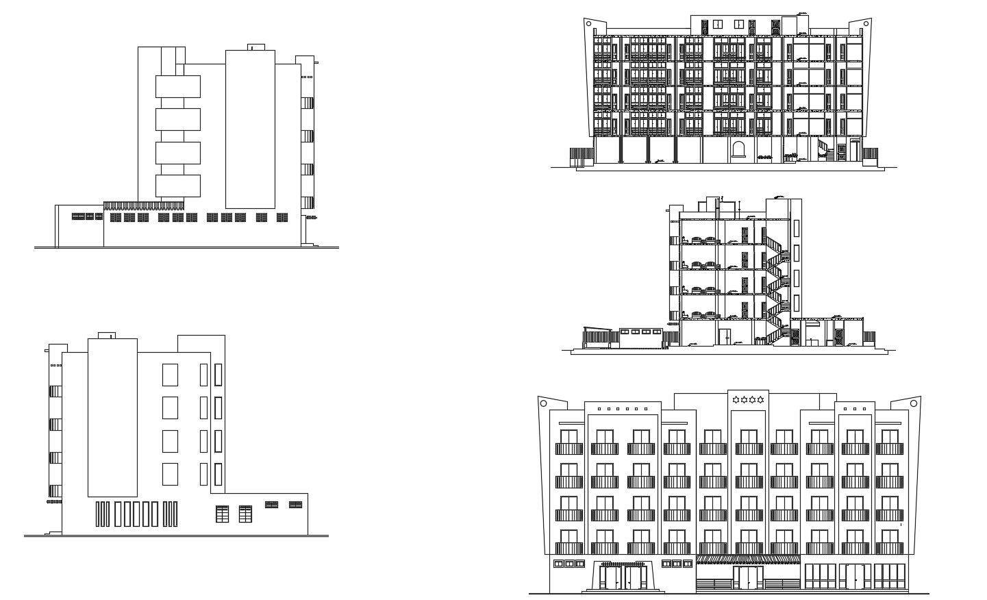 Autocad drawing of hotel elevations it include front facade,rear elevation,sections it also include basement area,ground floor ,first floor,second floor,third floor,terrace area,etc