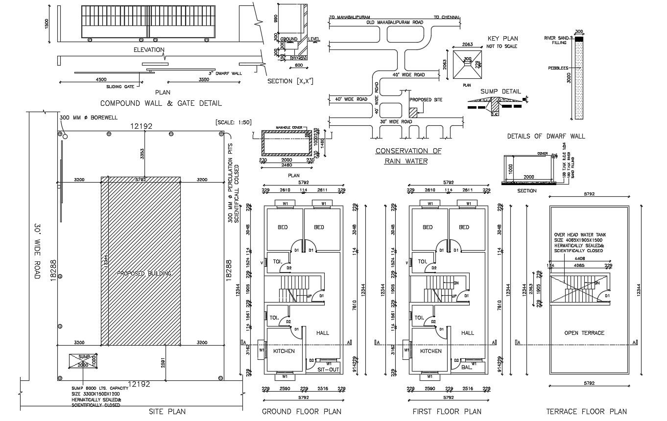 Dwg file of residential building it include key plan,site plan,ground floor plan,first floor plan,terrace plan,compound wall and gate detail,it also include kitchen,living room,bedrooms,balcony,bathroom,etc