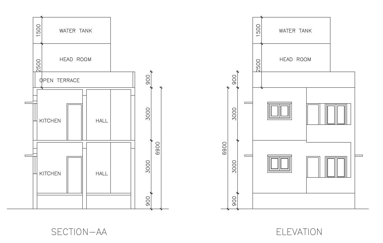 Residential building section in autocad it include front facade,section,floor level,terrace,water tank etc