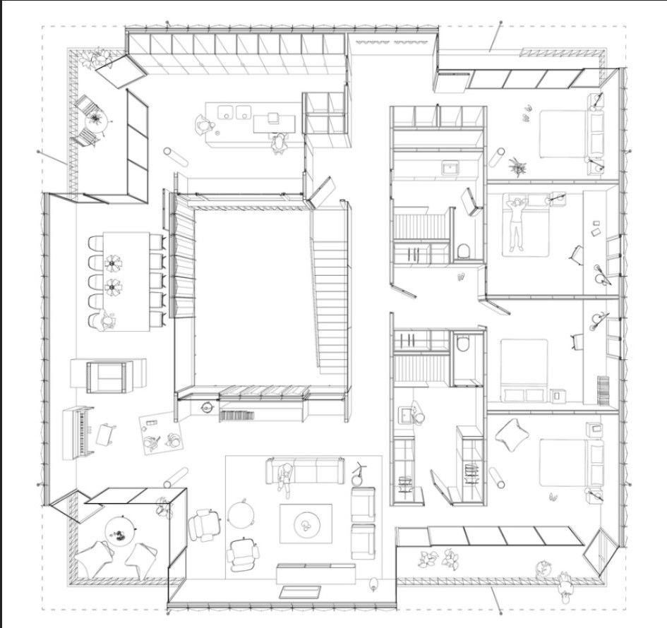 3D drawing of the residential house in AutoCAD it include top view, living area, dinning area, kitchen, bedrooms,etc