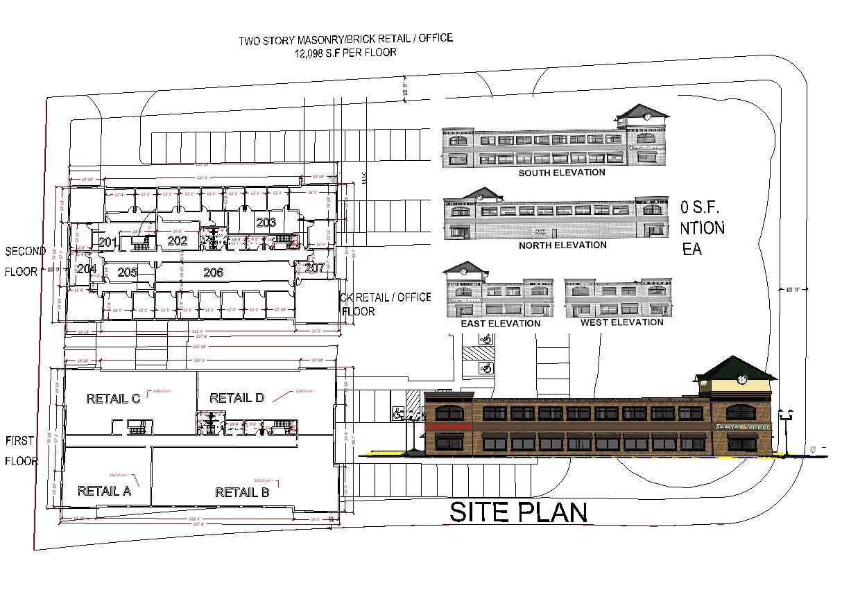 3D drawing of commercial building it include elevations, front facade,north elevation it also include floor level, shops, restaurant, etc
