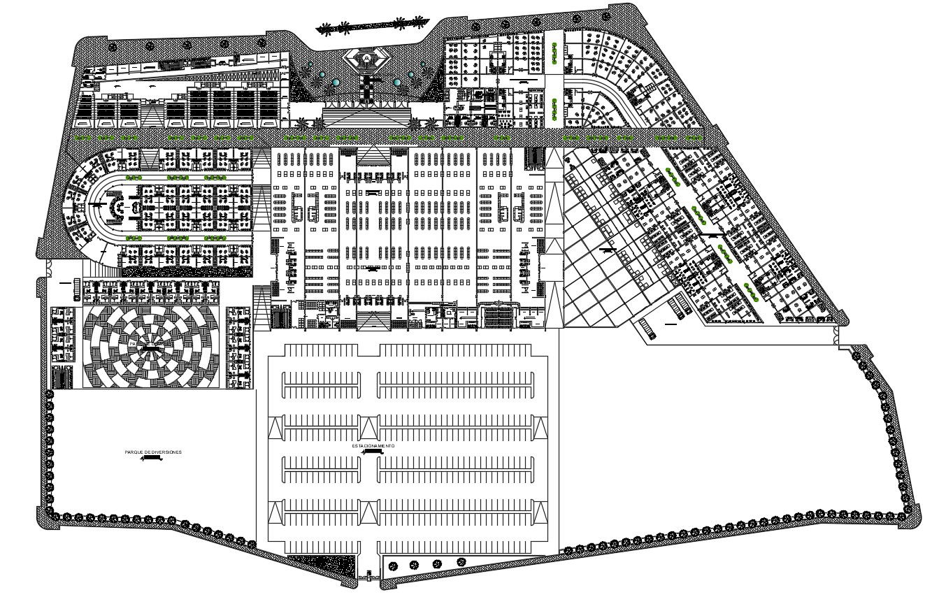 Dwg file of the commercial complex it includes floor plan, hypermarket, exhibition, parking area, restaurant, etc