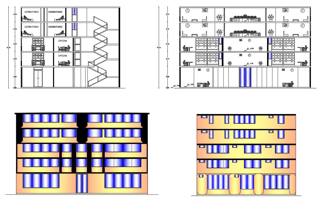 Residential apartment elevations in dwg file it includes front facade,rear elevation,sections it also include floor levels,offices,etc
