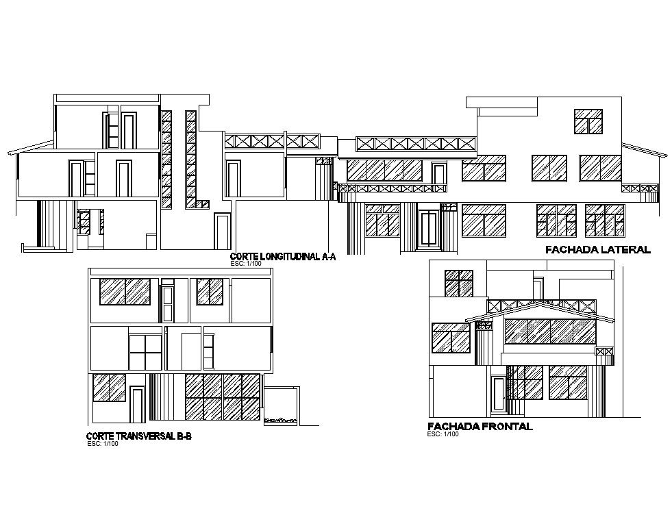 Drawing of the bungalow with different elevation in dwg file which provides detail of front elevation, detail of back elevation, detail of doors and windows, etc.