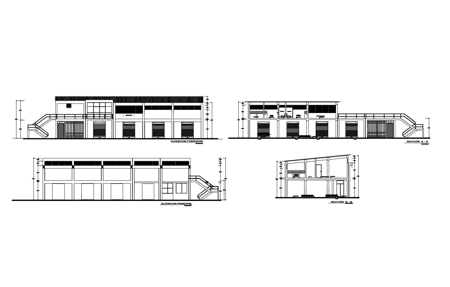 Drawing of office design with elevation and section in AutoCAD which provide detail of front elevation, back elevation, detail of floor level, etc.