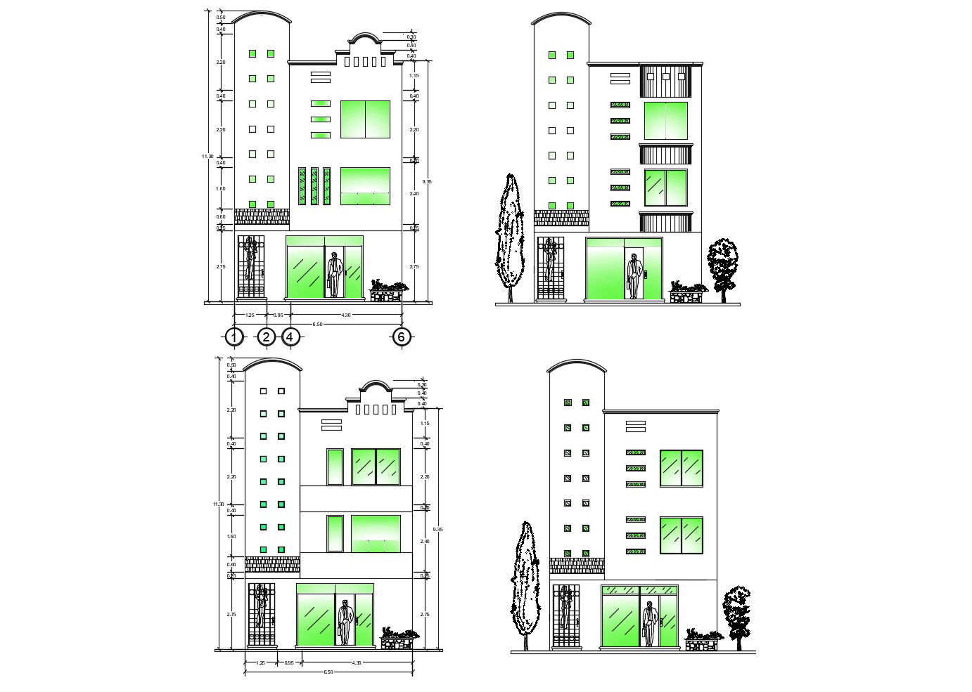 Residential apartment with detail dimension in dwg file which provides detail of front elevation, detail of outer design, detail of entrance, detail of floor level, etc.