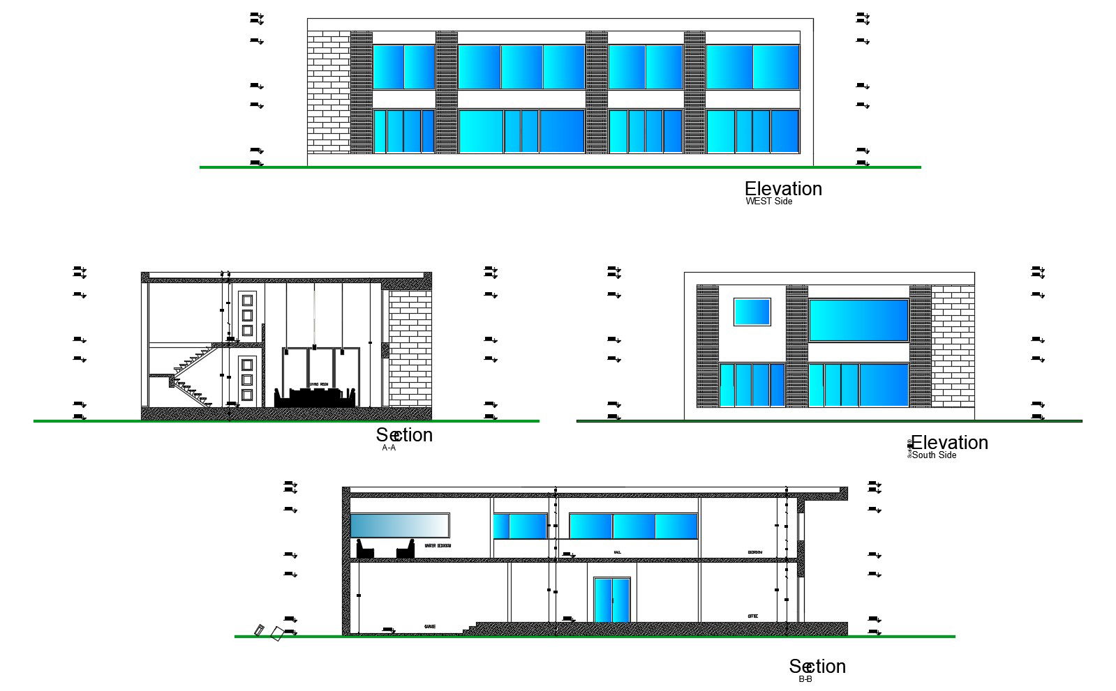 Elevation drawing of 2 storey house in AutoCAD which provide detail of front elevation, side elevation, back elevation, section details, detail of floor level.