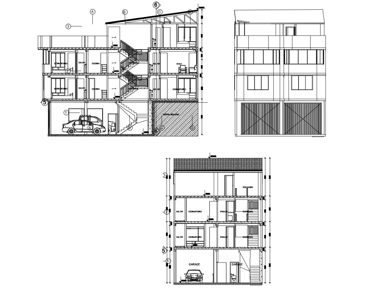 3 storey house with elevation details in AutoCAD it includes details of front elevation, section details, details of floor level, detail of doors and windows, etc.