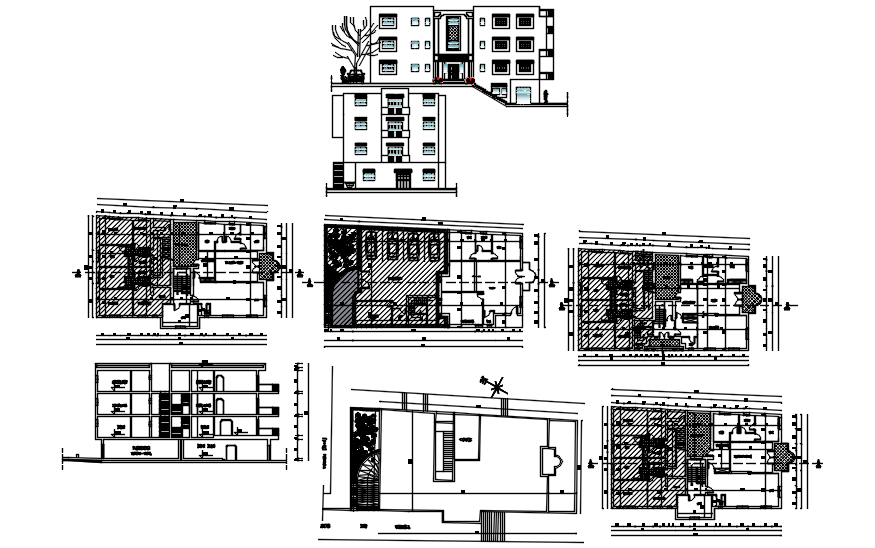 Autocad drawing of complex building 24.20mtr x 13.45mtr with detail dimension in dwg file which provides detail of different elevation and section, detail of floor level.