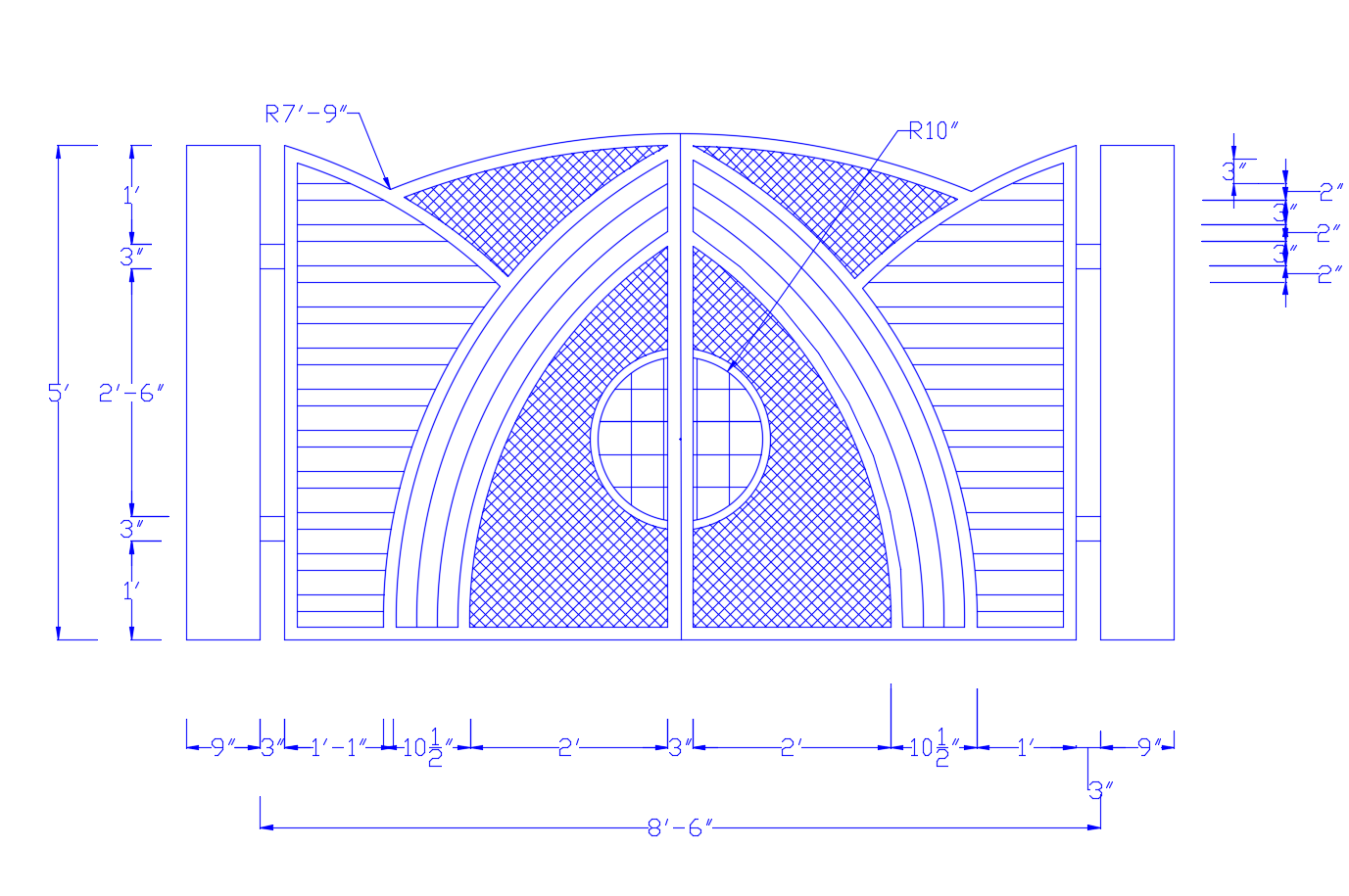 Dwg file of main gate design it includes grill, the pattern of door,pointed arches design,etc