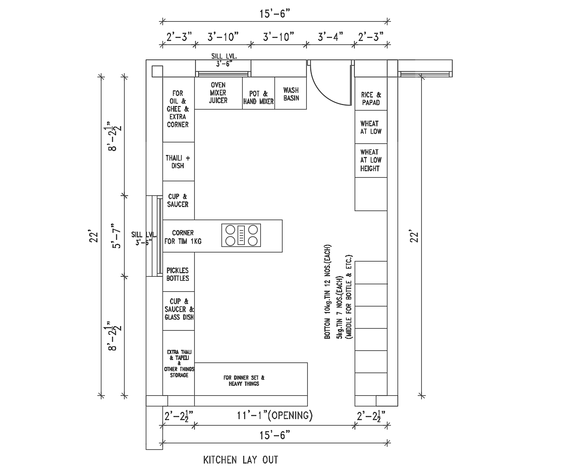 Autocad drawing of kitchen layout it include furniture layout,floor layout it also includes overhead unit,drawers,serving platform,etc