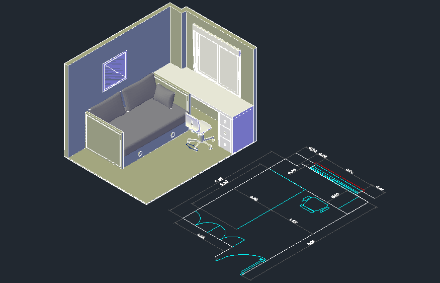 3d drawing of Room with detail dimension in dwg file which provides detail of room area, sofa cum bed, wardrobe, chair, doors and windows, etc.