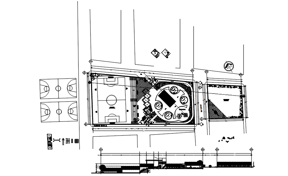Architectural plan of building 73.59mtr x 37.04mtr in AutoCAD it provides detail of elevation, detail of section, detail of floor level, etc.