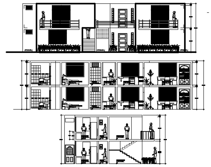 Residential bungalow elevation in dwg file it includes front facade,sectional elevations it also includes floor level,staircase,rooms,etc