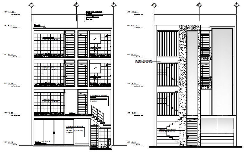 Autocad drawing residential apartment elevations it includes front facade,sectional elevation it also includes floor level,terrace level,grill,etc
