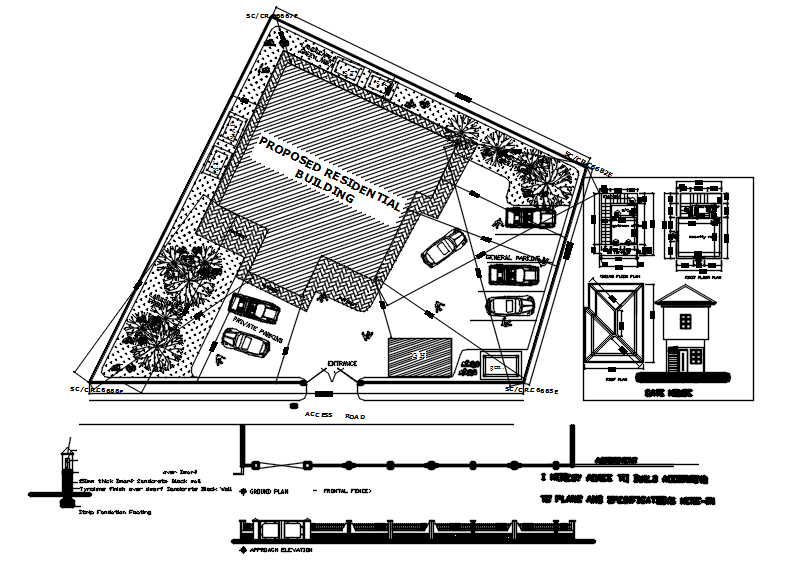Dwg file of site layout it includes proposed floor layout,main gate fencing, gatehouse,etc