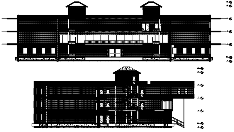 Elevation drawing of the institute in AutoCAD which provide detail of back elevation, side elevation, detail of floor level, etc.