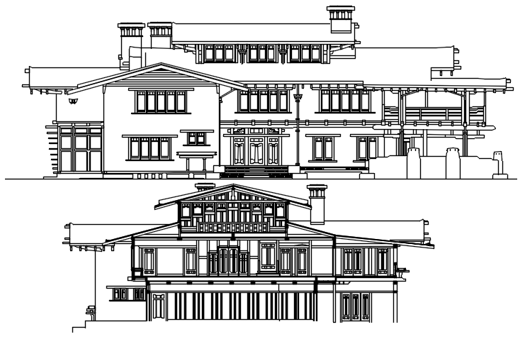 Sectional elevations of bunglow in autocad it include front facade,rear elevation it also include floor level,doors,windows,roofs,balcony,etc